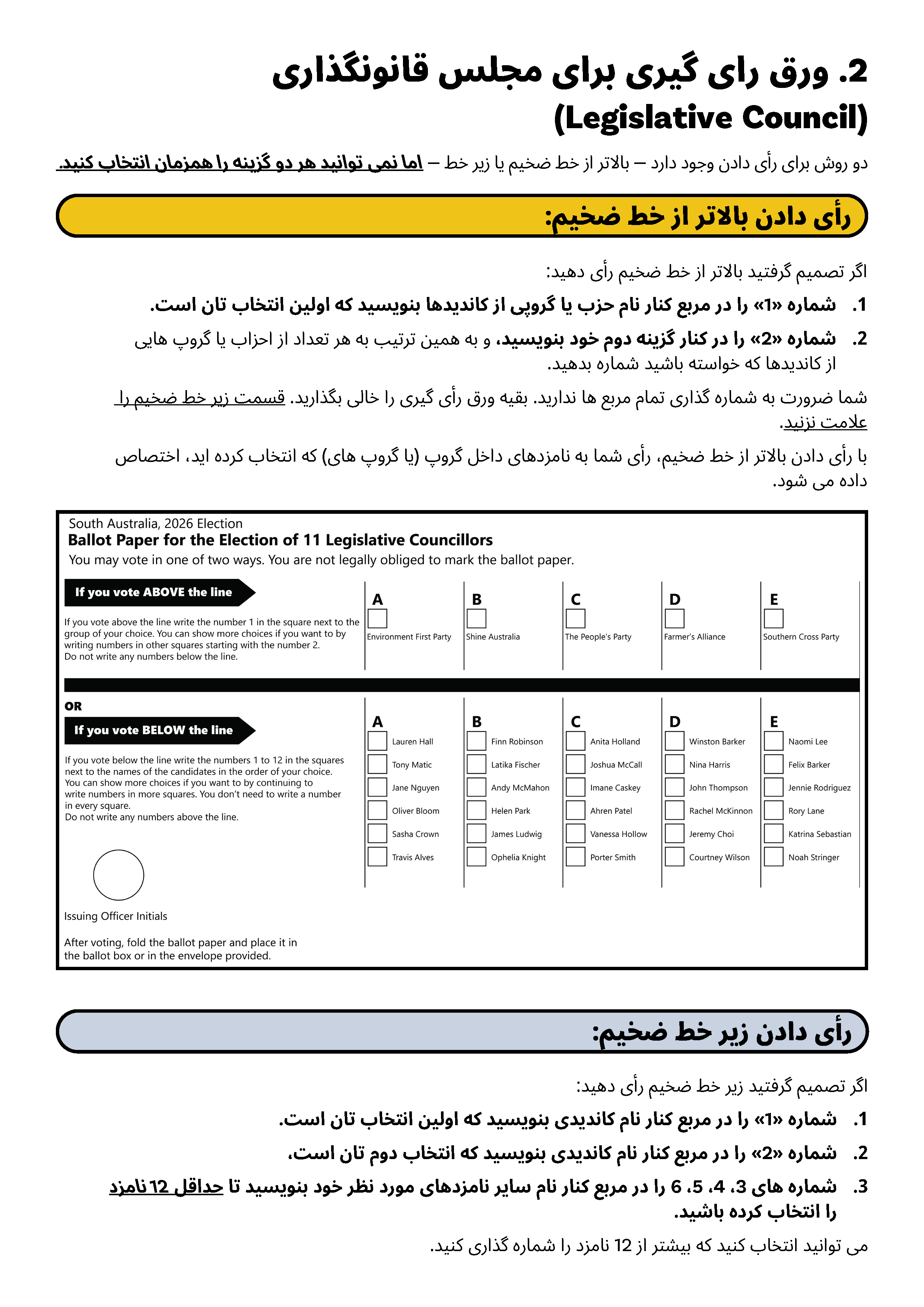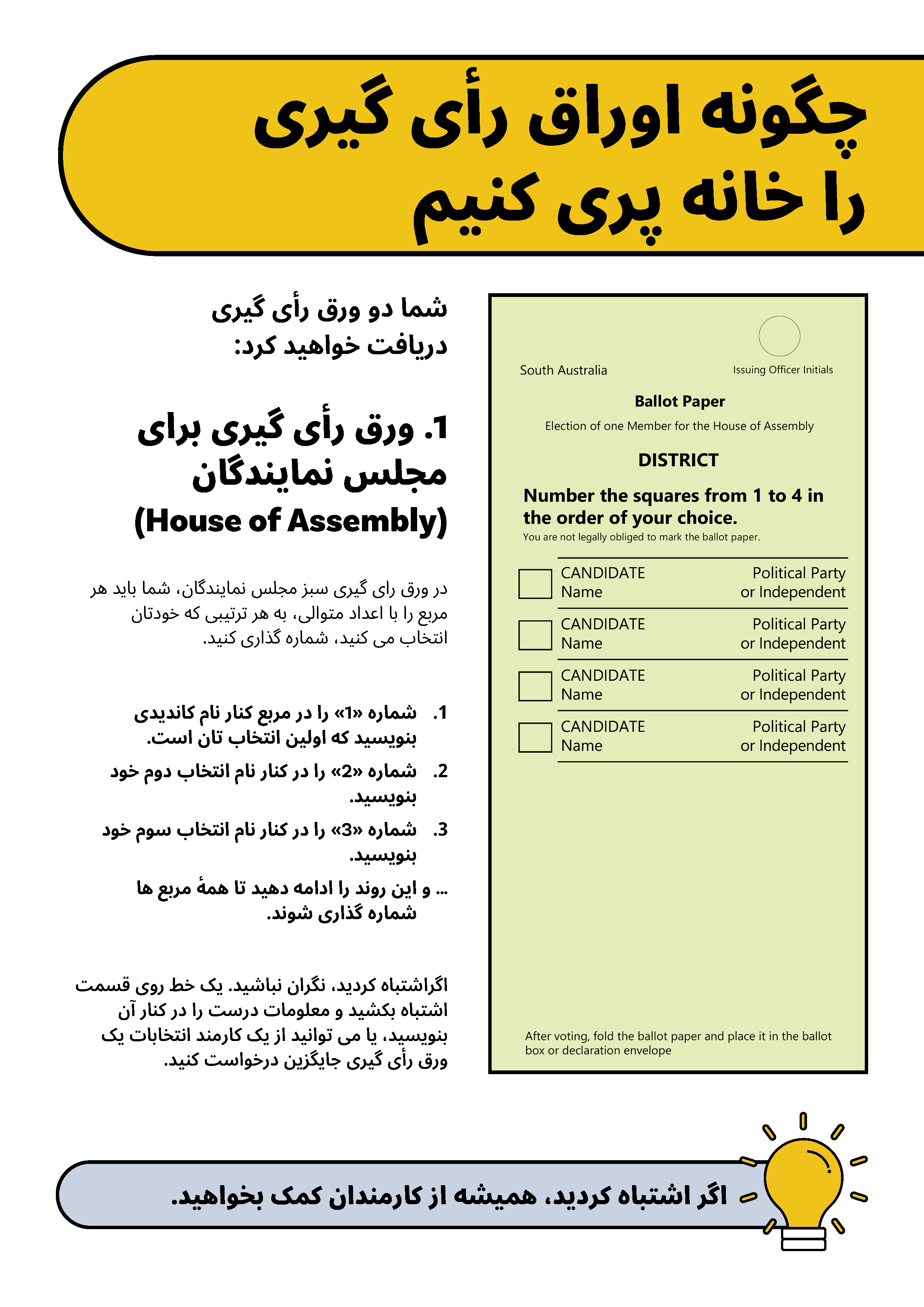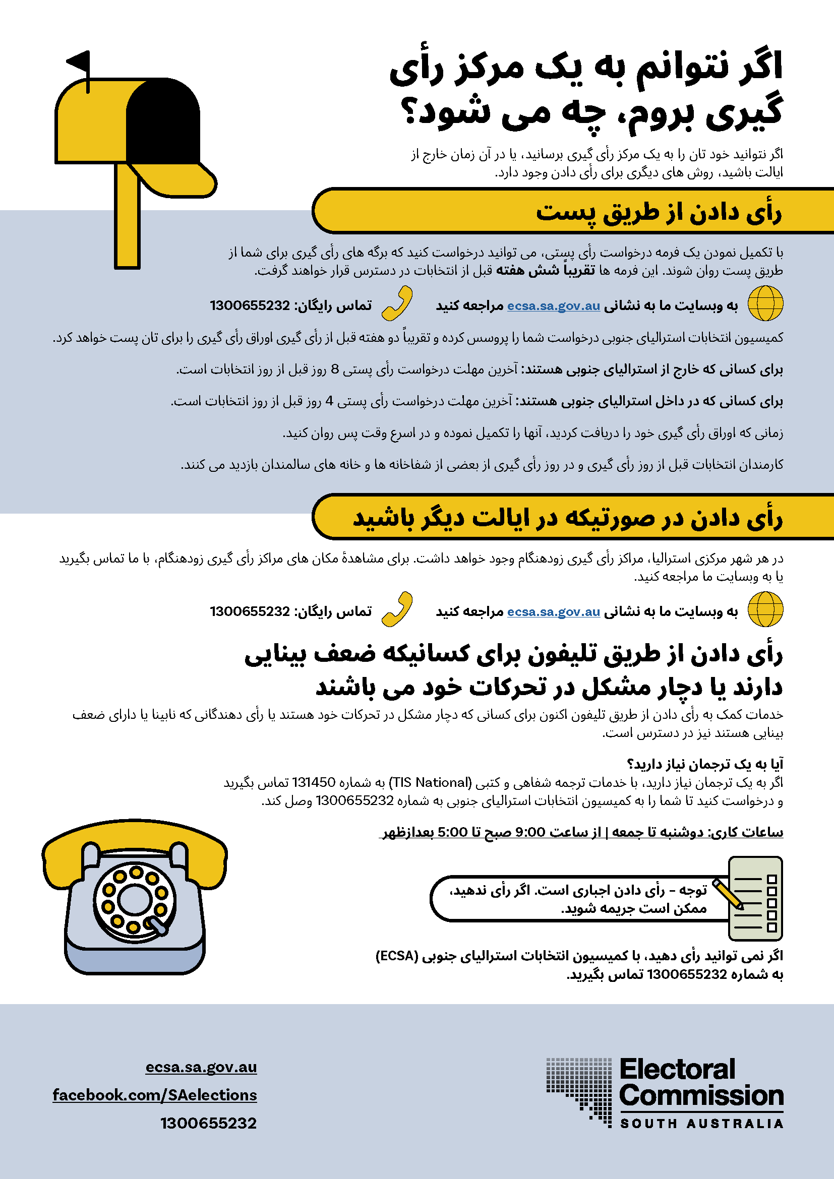 إذا كنت بحاجة إلى مترجم، يرجى الاتصال بخدمة الترجمة الكتابية والشفهية (TIS National) على الرقم 13 14 50 واطلب منهم الاتصال بالمفوضية الانتخابية لجنوب أستراليا على الرقم 1300 655 232. ساعات العمل من الساعة 9 صباحاًوحتى 5 مساءً (التوقيت القياسي المركزي CST) من الاثنين إلى الجمعة.
