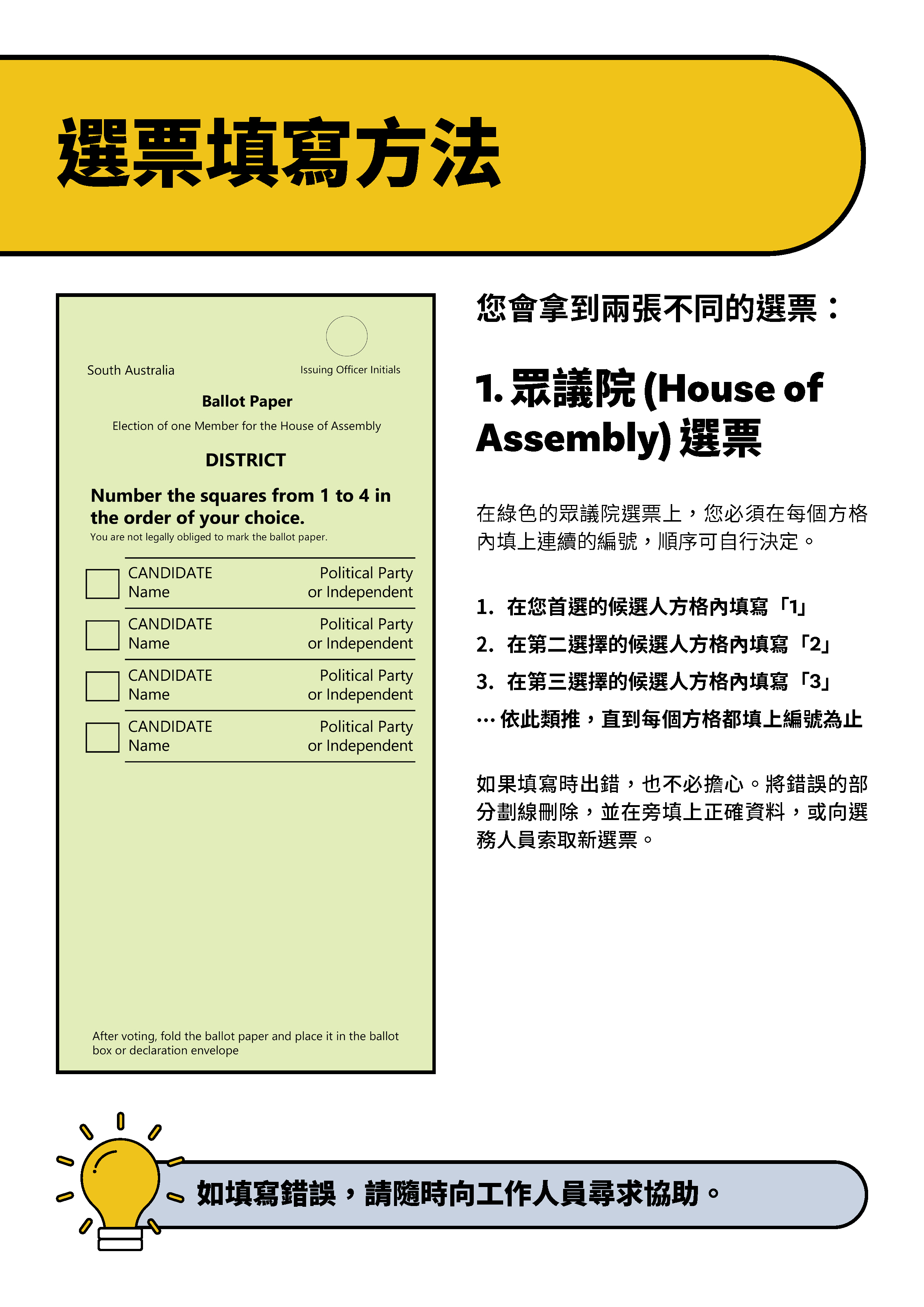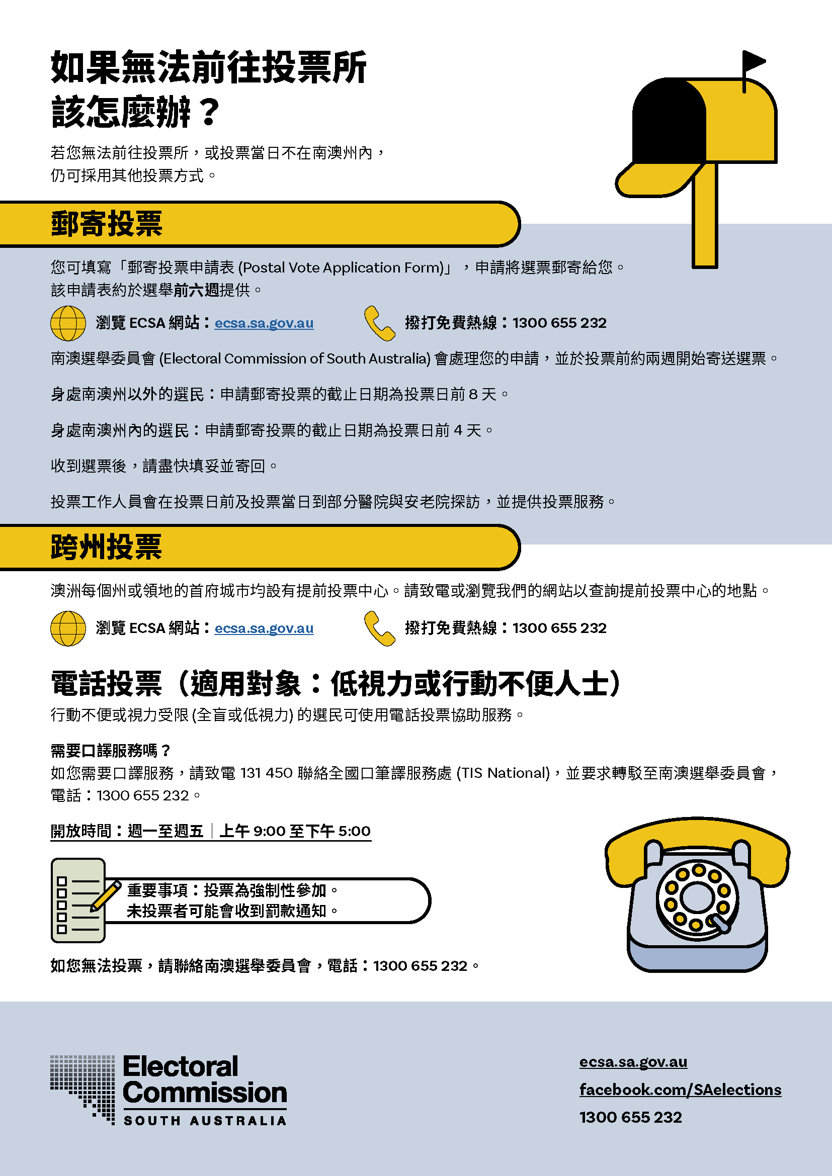 如需傳譯員,請致電131 450全國翻譯及傳譯服務(TIS National),並要求轉接1300 655 232 南澳州選舉委員會。我們的辦工時間是星期一至星期五,上午9點至下午5點(中部標準時間)。
