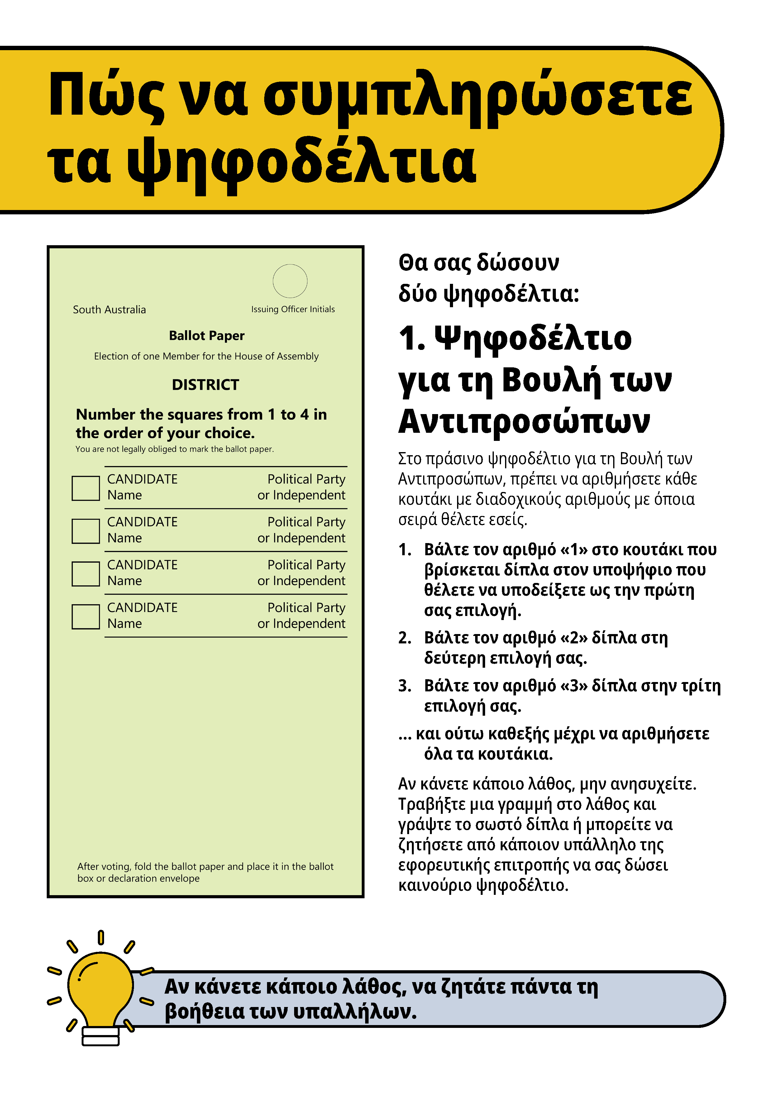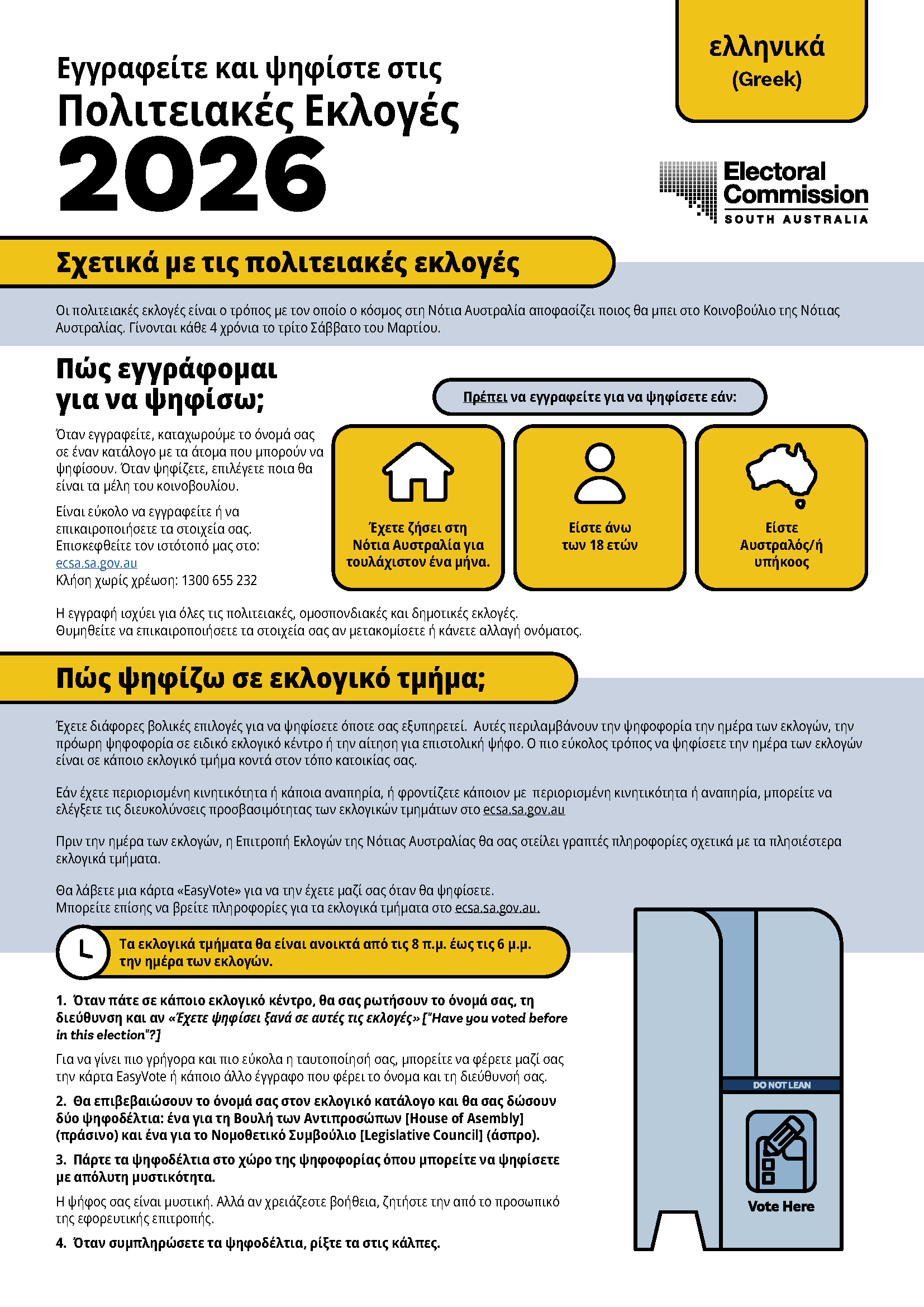 Αν χρειάζεστε διερμηνέα, παρακαλούμε τηλεφωνήστε στην Υπηρεσία Μεταφραστών και Διερμηνέων (TIS National) στον αριθμό 13 14 50 και ζητήστε τους να τηλεφωνήσουν στην Εκλογική Επιτροπή ΝΑ στον αριθμό 1300 655 232. Οι ώρες λειτουργίας μας είναι 9πμ έως 5μμ (Κεντρική Κανονική Ώρα) Δευτέρα με Παρασκευή.