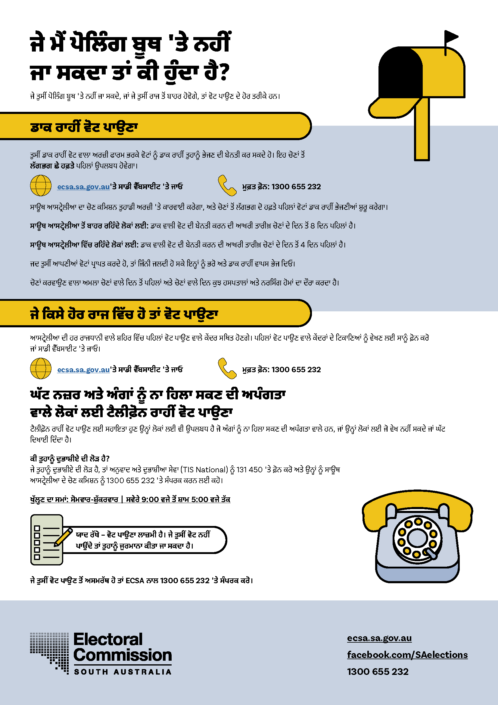 ਜੇਕਰ ਤੁਹਾਨੂੰ ਦੋਭਾਸ਼ੀਏ ਦੀ ਲੋੜ ਹੈ, ਤਾਂ ਕ੍ਰਿਪਾ ਕਰਕੇ ਅਨੁਵਾਦ ਅਤੇ ਦੋਭਾਸ਼ੀਆ ਸੇਵਾ (Translating and Interpreting Service - TIS ਨੇਸ਼ਨਲ) ਨੂੰ 13 14 50 ਤੇ ਫੋਨ ਕਰੋ ਅਤੇ ਉਨ੍ਹਾਂ ਨੂੰ Electoral Commission SA ਨੂੰ 1300 655 232 ਤੇ ਫੋਨ ਕਰਨ ਲਈ ਕਹੋ। ਸਾਡੇ ਕੰਮ ਕਰਨ ਦੇ ਸਮੇਂ ਸੋਮਵਾਰ ਤੋਂ ਸ਼ੁਕਰਵਾਰ ਸਵੇਰੇ 9:00 ਵਜੇ ਤੋਂ ਲੈ ਕੇ ਸ਼ਾਮੀ 5:00 ਵਜੇ (CST) ਤੱਕ ਹਨ।
