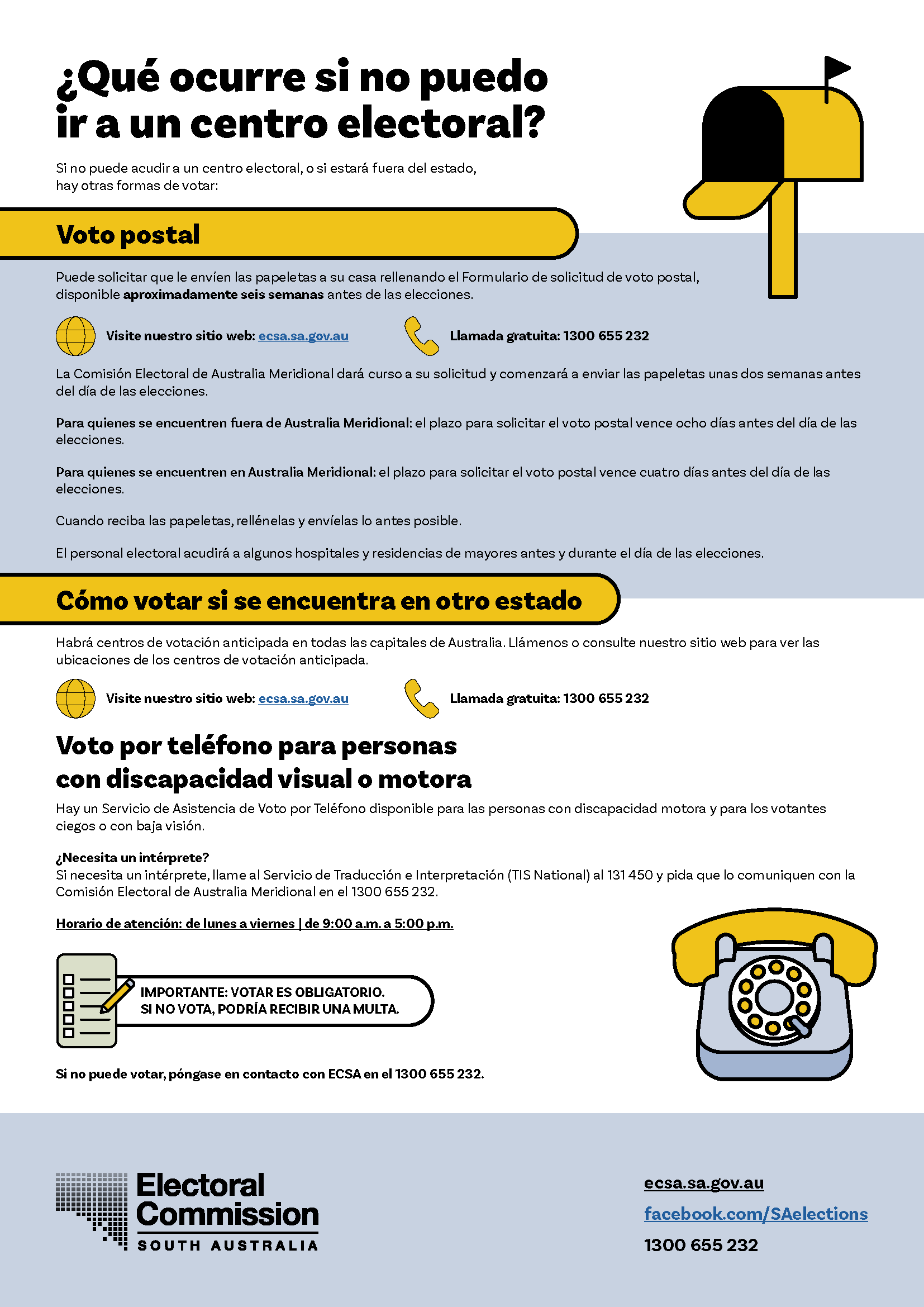 Si necesitara la asistencia de un intérprete, llame al Servicio de Traducción e Interpretación (TIS National) en el 13 14 50 y pida que le comuniquen con la Comisión Electoral de Australia Meridional [Electoral Commission SA] en el 1300 655 232. Nuestro horario de oficina es de 9:00 am a 5:00 pm (CST) de lunes a viernes.