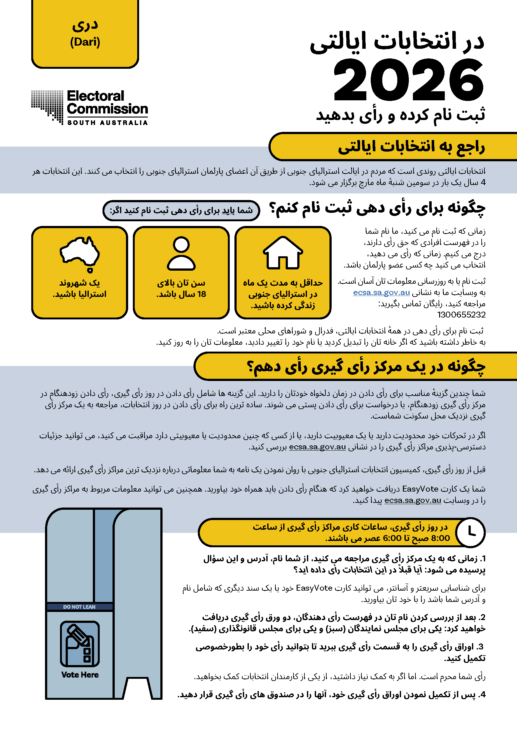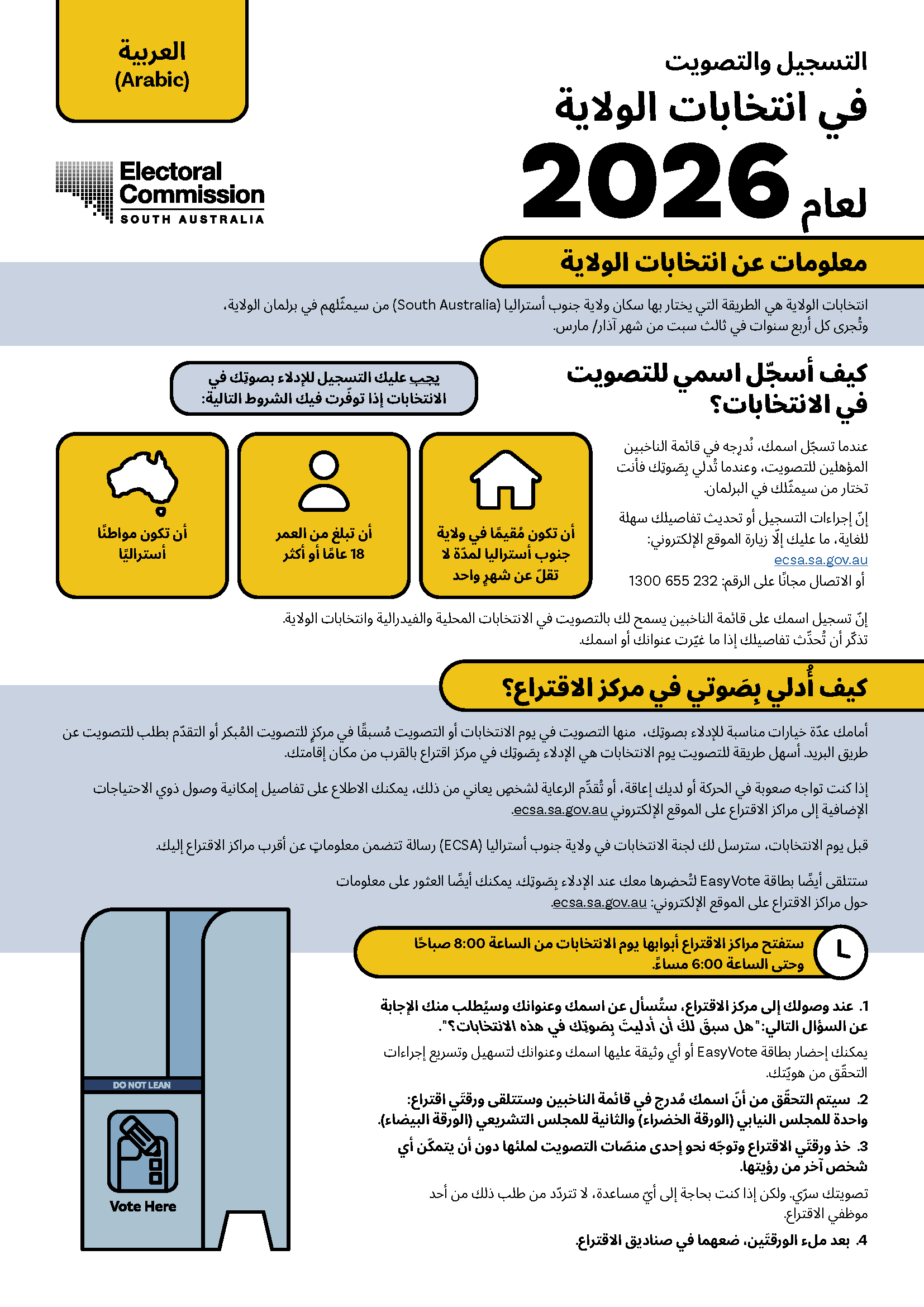 إذا كنت بحاجة إلى مترجم، يرجى الاتصال بخدمة الترجمة الكتابية والشفهية (TIS National) على الرقم 13 14 50 واطلب منهم الاتصال بالمفوضية الانتخابية لجنوب أستراليا على الرقم 1300 655 232. ساعات العمل من الساعة 9 صباحاًوحتى 5 مساءً (التوقيت القياسي المركزي CST) من الاثنين إلى الجمعة.