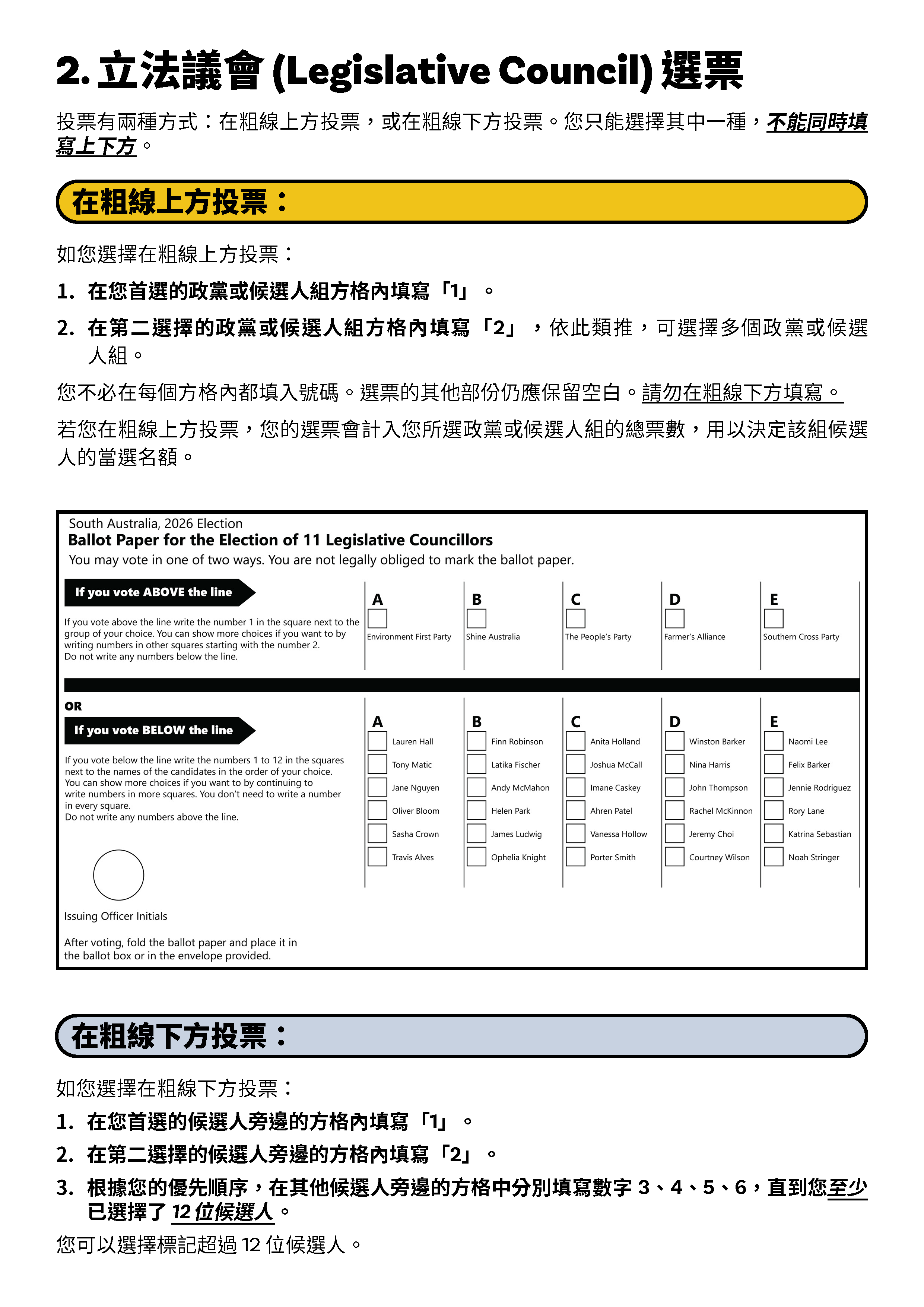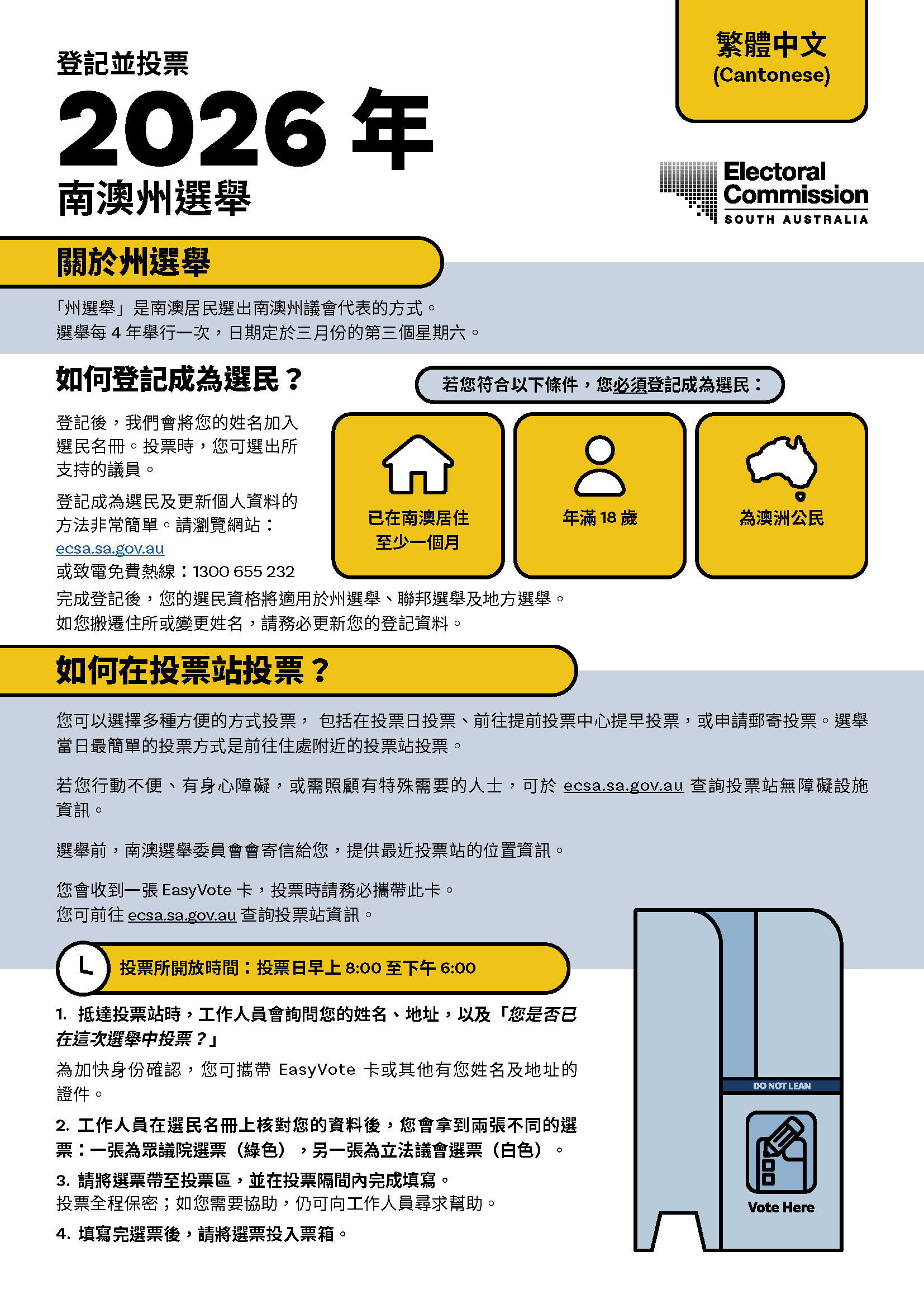 如需傳譯員,請致電131 450全國翻譯及傳譯服務(TIS National),並要求轉接1300 655 232 南澳州選舉委員會。我們的辦工時間是星期一至星期五,上午9點至下午5點(中部標準時間)。