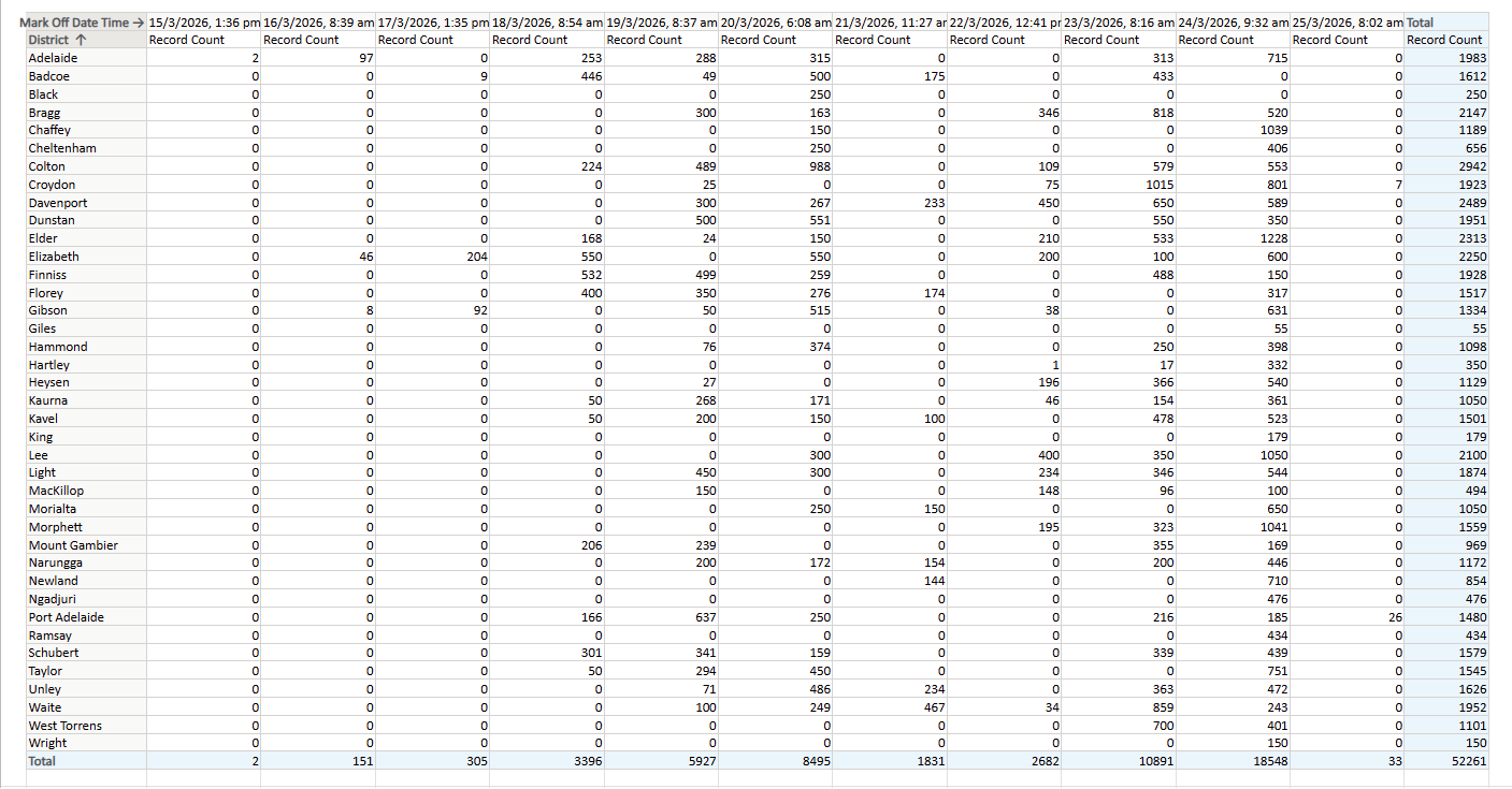 | Morphett | 1,424 | 1,501 | 1,474 | 1,384 | 2,055 | 1,801 | 9,329 |