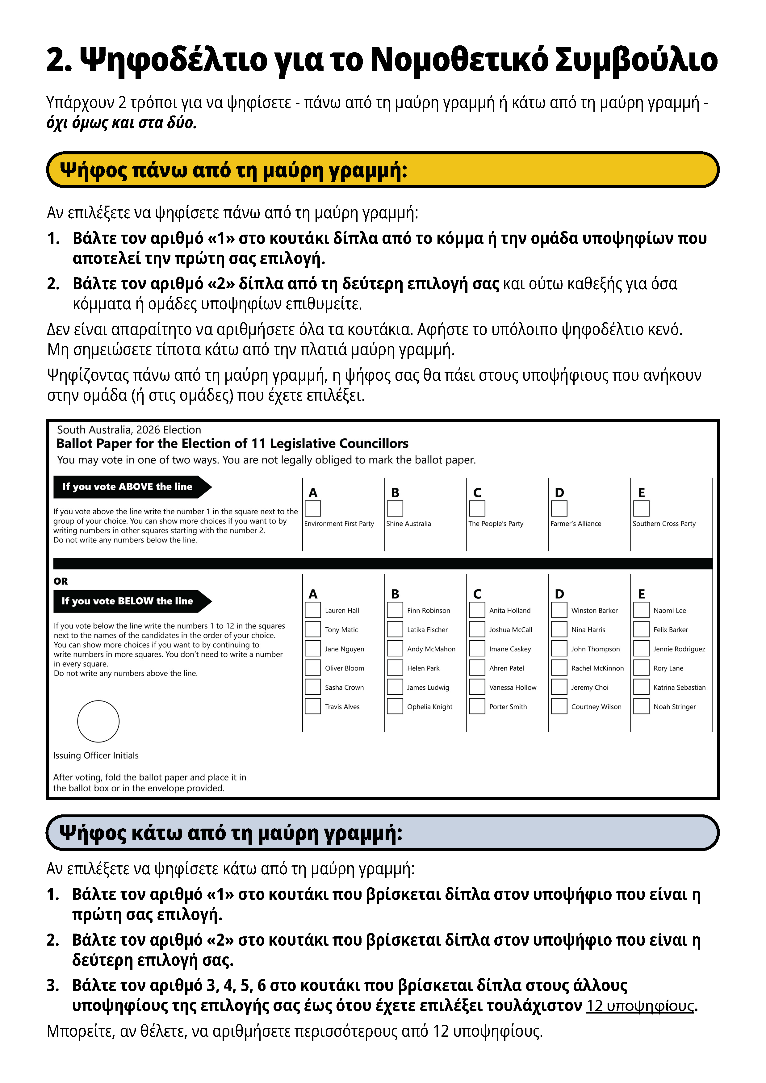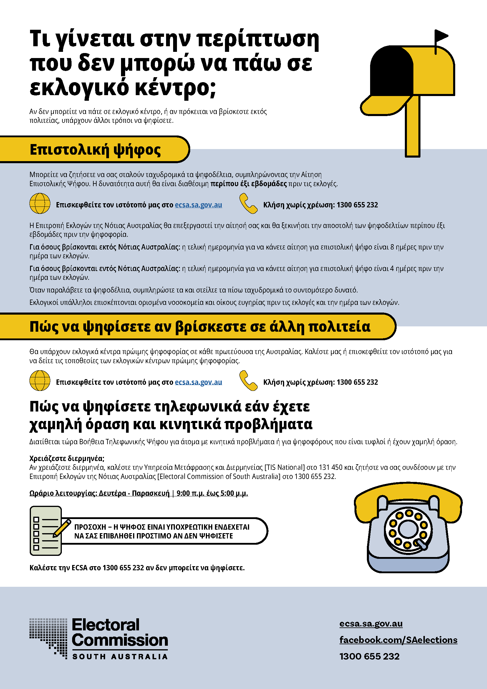 Αν χρειάζεστε διερμηνέα, παρακαλούμε τηλεφωνήστε στην Υπηρεσία Μεταφραστών και Διερμηνέων (TIS National) στον αριθμό 13 14 50 και ζητήστε τους να τηλεφωνήσουν στην Εκλογική Επιτροπή ΝΑ στον αριθμό 1300 655 232. Οι ώρες λειτουργίας μας είναι 9πμ έως 5μμ (Κεντρική Κανονική Ώρα) Δευτέρα με Παρασκευή.