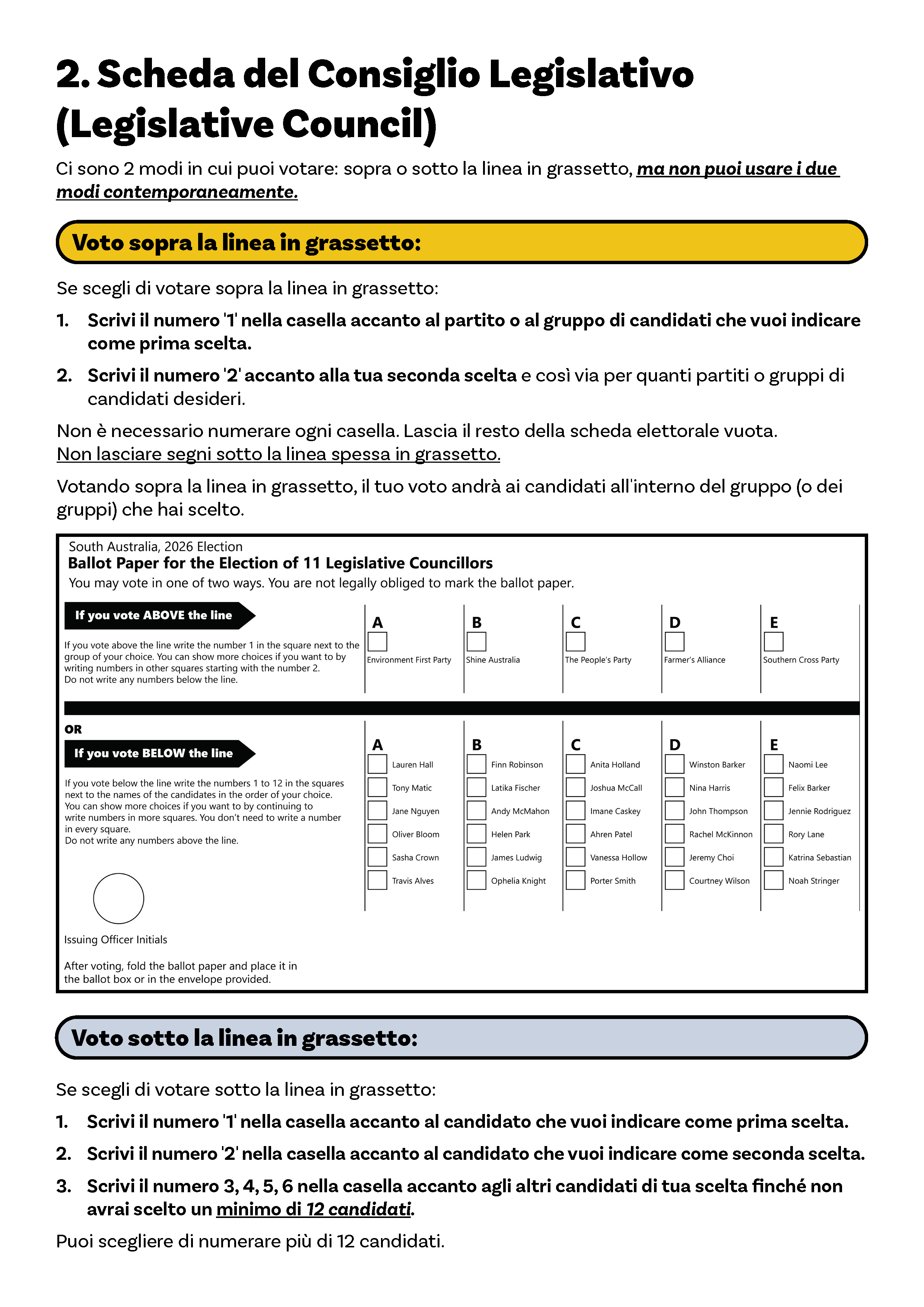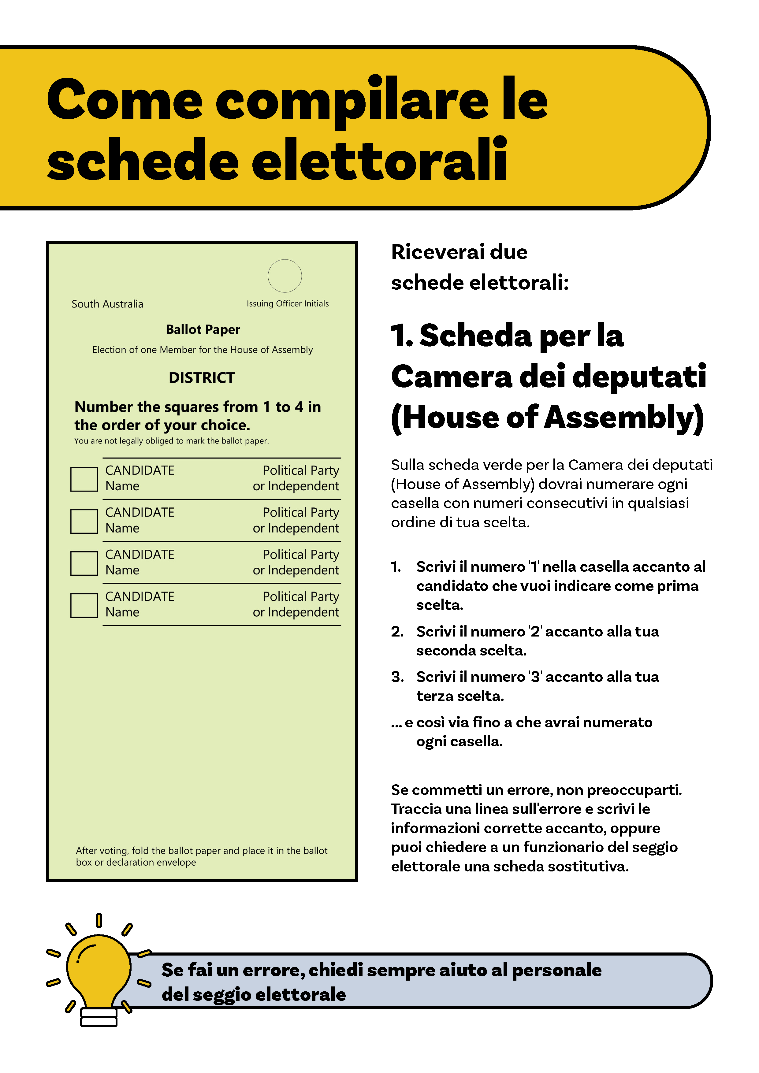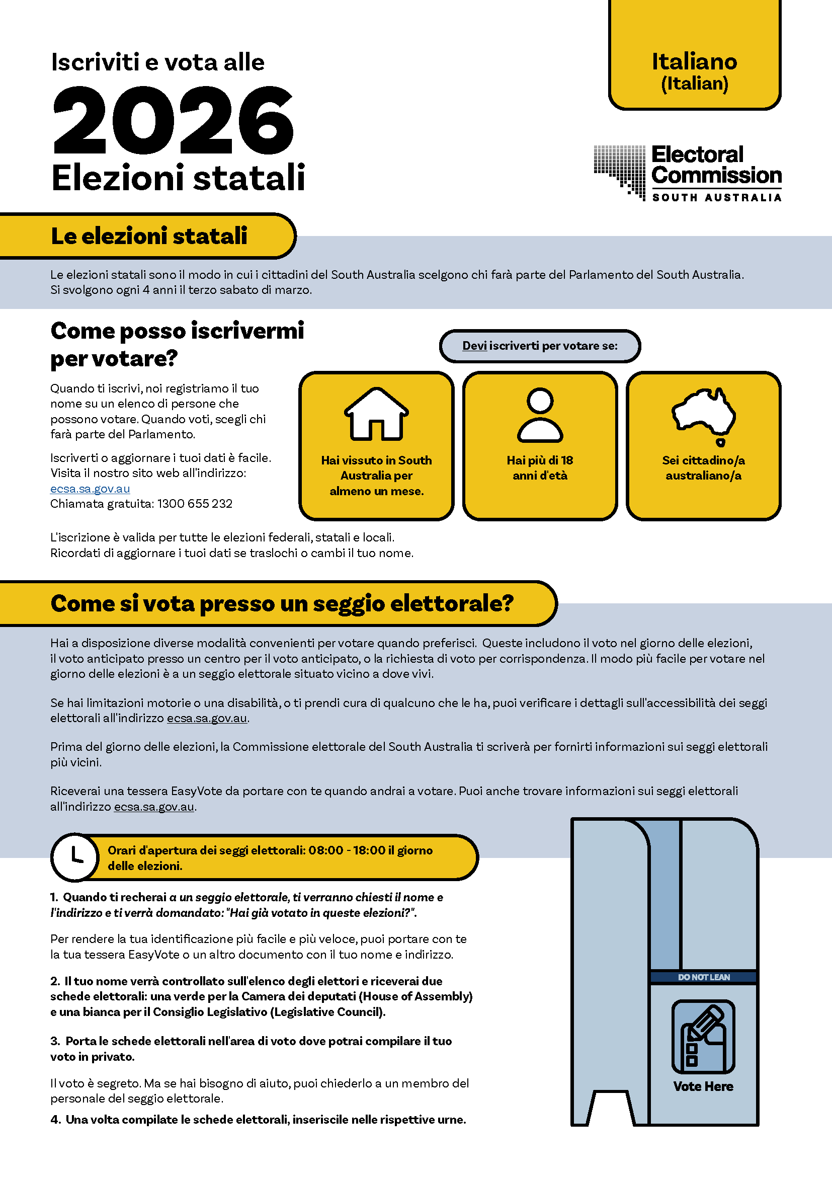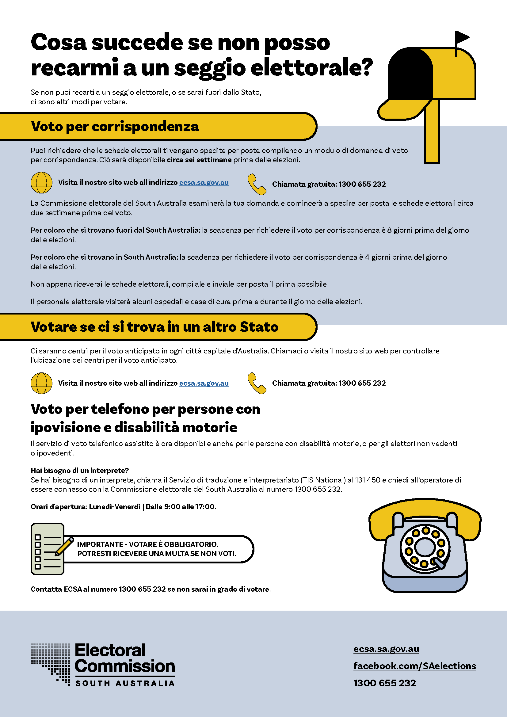 Se hai bisogno di un interprete, chiama il Servizio di traduzione e interpretariato (TIS National) al 13 14 50 e chiedi loro di chiamare l’Electoral Commission SA al 1300 655 232. I nostri orari di apertura sono dalle 9:00 alle 17:00 (CST) dal lunedì al venerdì.