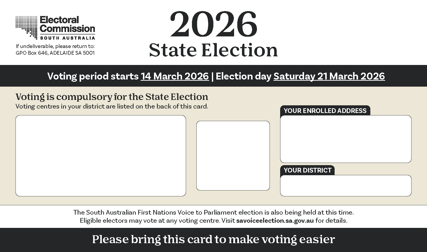 In early March, South Australian voters will receive an EasyVote Card in the post. These will include accessibility ratings for polling locations on the back. The card features a unique QR code that can be scanned when voting. This will instantly mark the electors name off the electoral roll, making the voting experience streamlined and faster. The card also includes a list of the electors nearest polling booths.