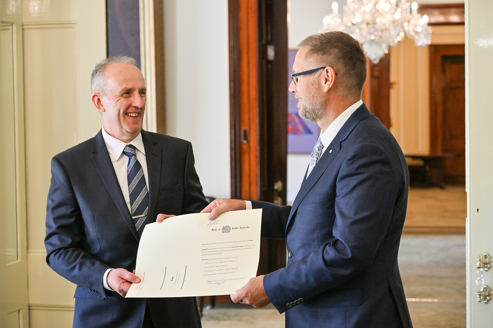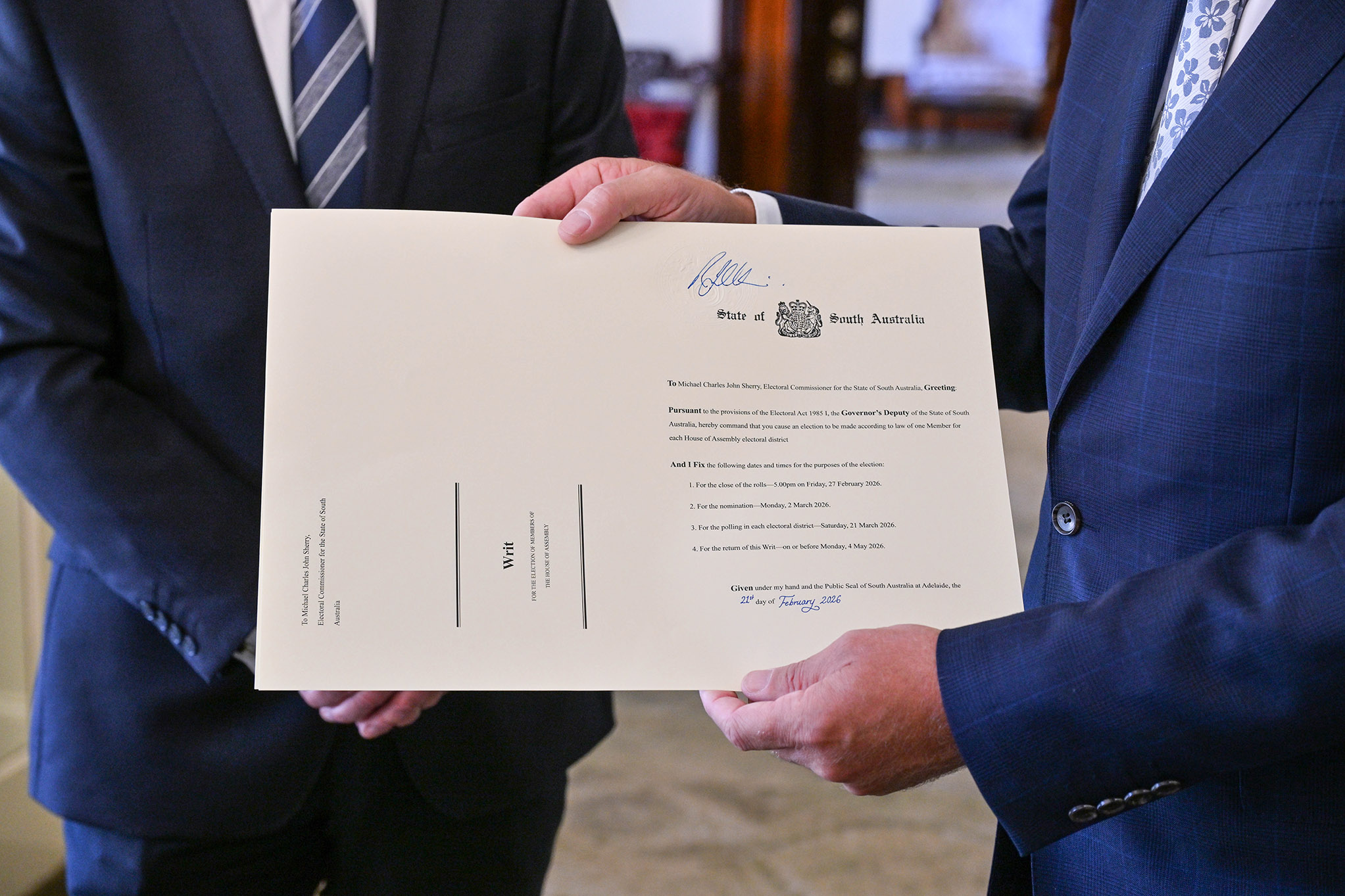 Today His Excellency, the Honourable Dr Richard Harris SC OAM, the Governor’s Deputy of South Australia, issued the writs for the 2026 State Election, ending the fifty-fifth South Australian Parliament and formally triggering the election process.